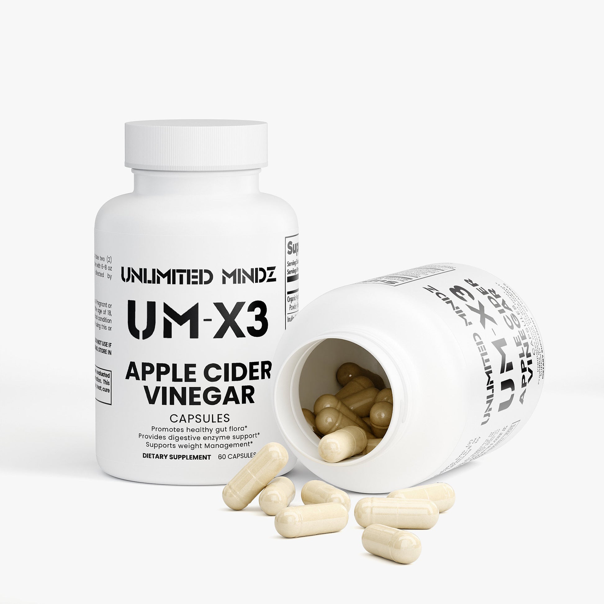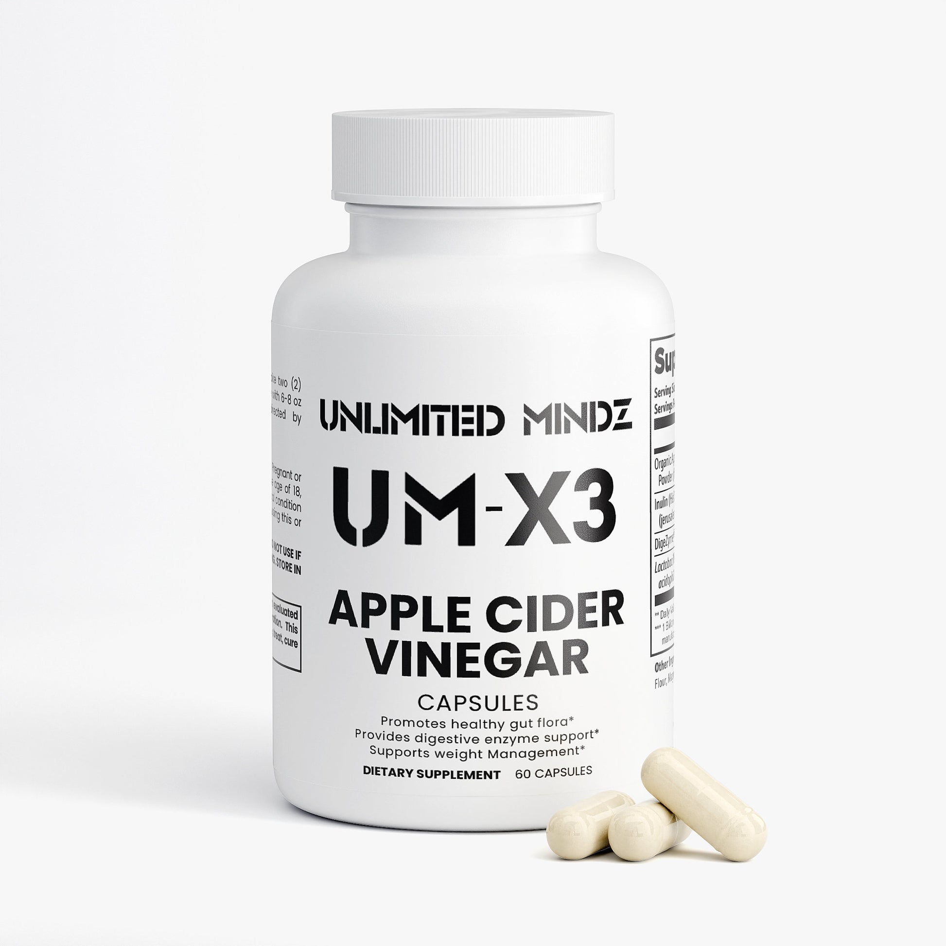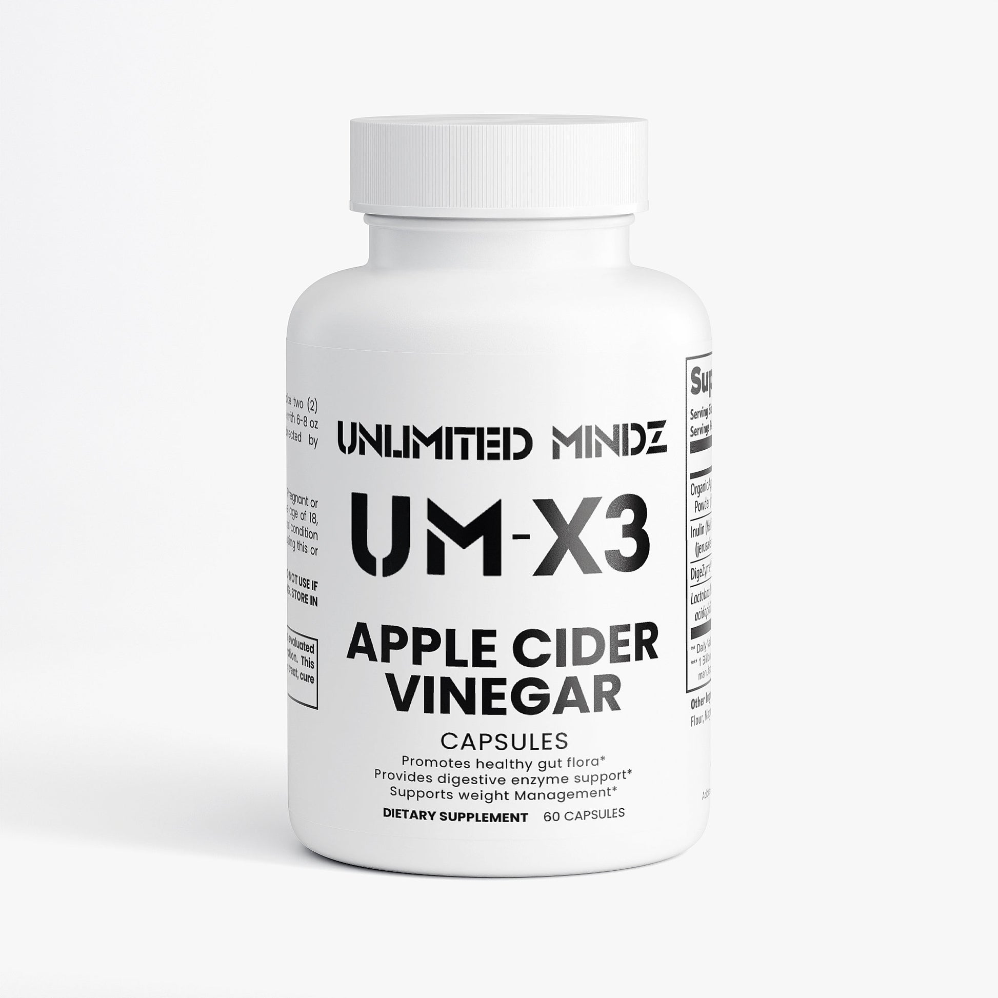 Discover the benefits of UM-X3 apple cider vinegar (ACV) without the harsh taste or acidity. Each serving delivers 1000 mg of ACV powder, known to support digestive health, gut balance, and normal metabolism. ACV may help promote a healthy gut environment by supporting beneficial bacteria and aiding in the breakdown of food. It's a simple, convenient way to experience the traditional benefits of ACV - no vinegar shots required.