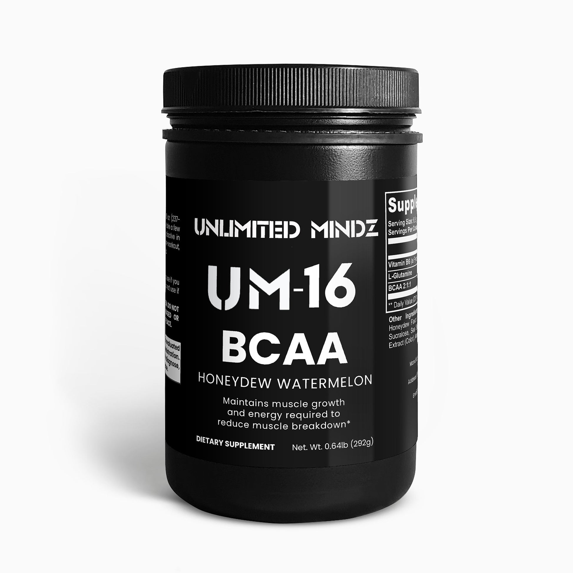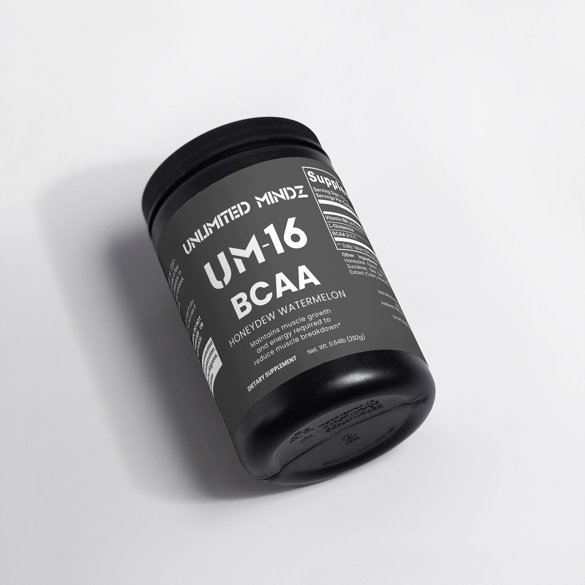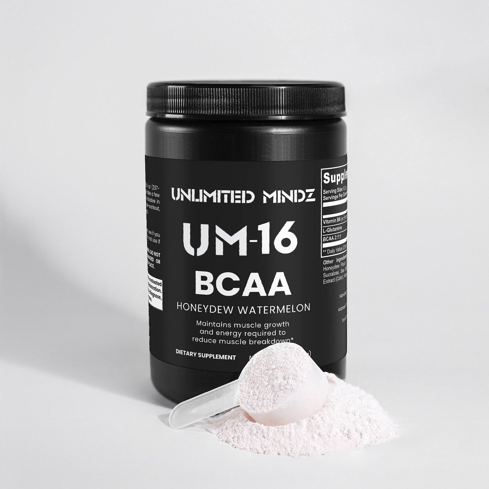 UM-16 BCAA Post Workout Powder is a blend of 5000mg of branched-chain amino acids and Glutamine for lean muscle and recovery. It contains the ideal ratio of 2 parts Leucine to 1 part Isoleucine and Valine. These amino acids increase protein synthesis and nitrogen retention, both essential to building lean muscle.