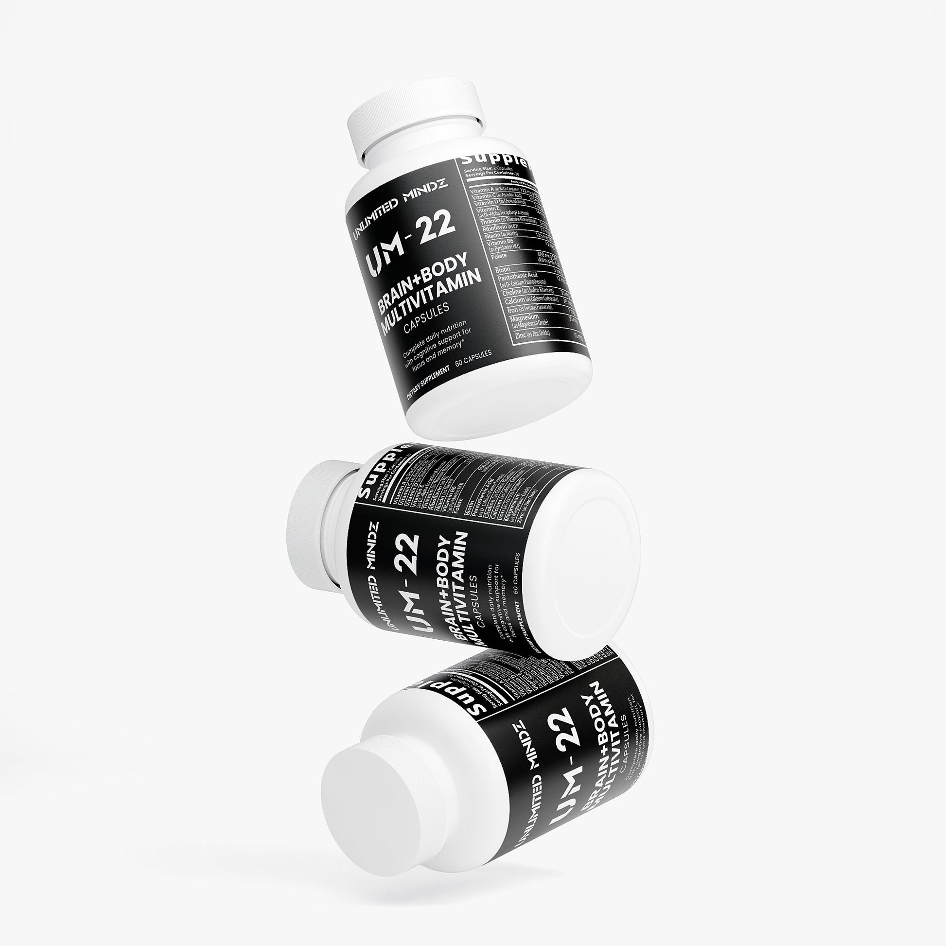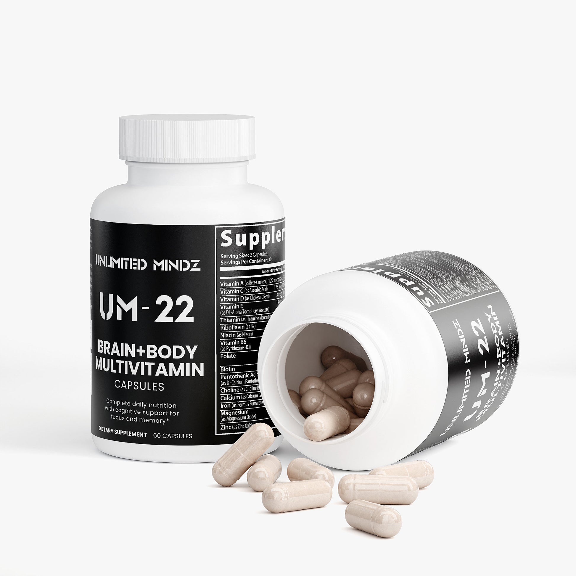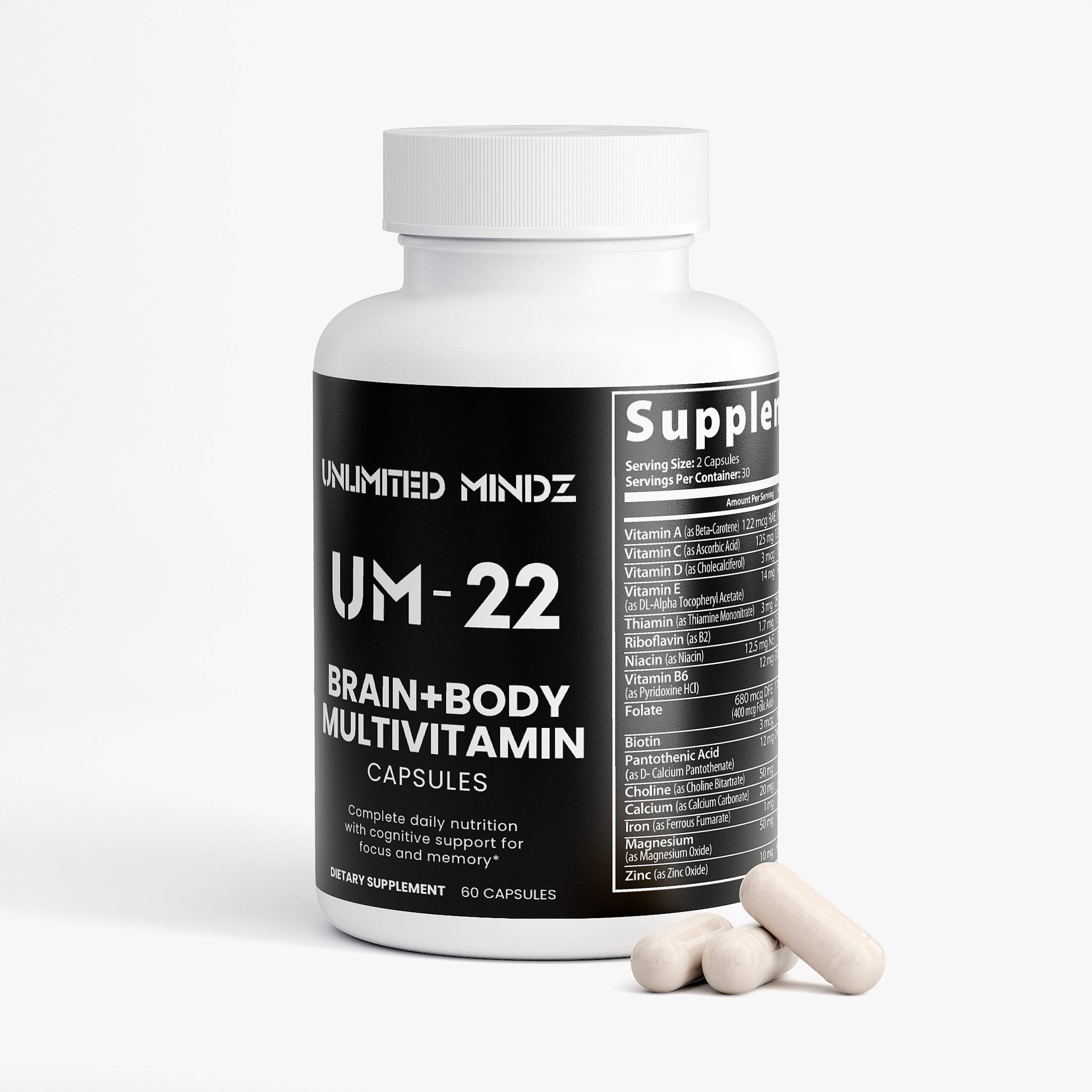 UM-22 (His) Brain + Body Multivitamin combines a number of powerful amino acids such as Dimethylaminoethanol (DMAE Bitartrate), L-Glutamine, and GABA, which enhance neuroactivity with plant extracts such as Bacopa that alter neurochemistry to improve focus, learning, and intelligence.